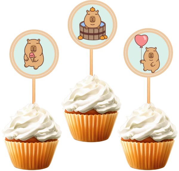 Pack de 10 Cupcakes Toppers temático de Carpinchos, elaborados en papel resistente , perfectos para decorar tortas, cupcakes y mesas dulces.